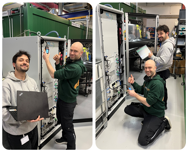 After benchmarking and evaluating more than 300 electrolyzer suppliers, we selected an AEM electrolyzer from Enapter, supplied via H2 Core Systems, as the hydrogen sub-system for our demo unit. We’re pleased to report that commissioning and first power-on went exceptionally smoothly: the system was fully leak-tight, startup was straightforward, and the technical support from both suppliers was outstanding.